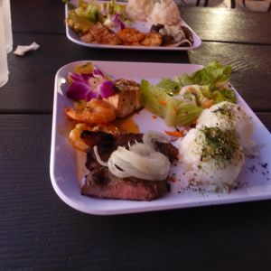 デイナーのメニューも美味しく、B級グルメと言っていましたが、今ではハワイの王道のような感じのお料理でしたよ!一緒についていた、冷たいお水が、常夏のハワイには最高でした!ドリンクの持ち込みが自由と聞いていましたが、暑さにやられた私の体にはもってこいでしたね!
