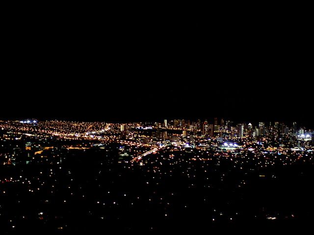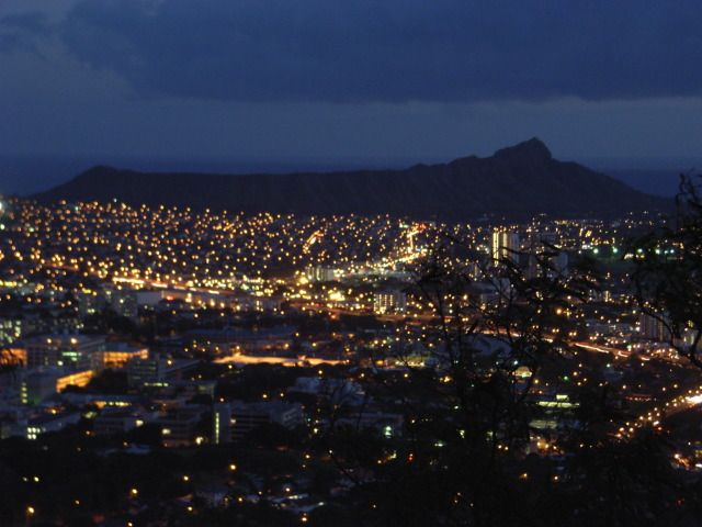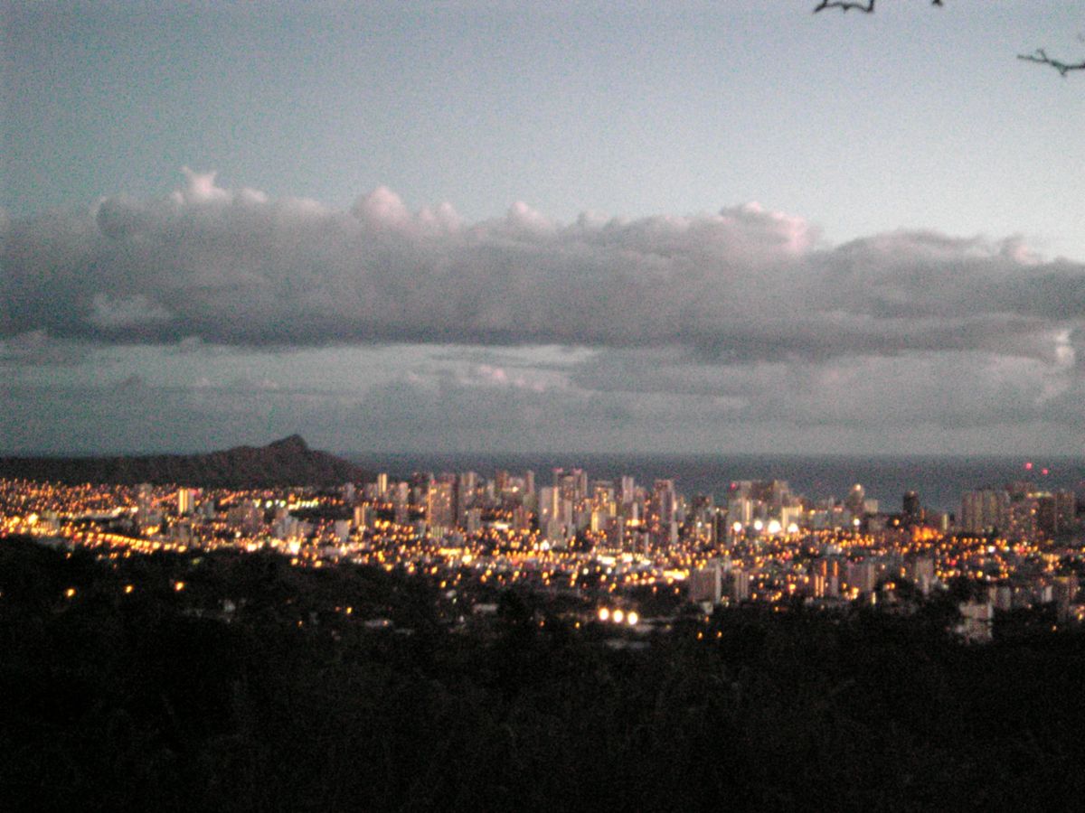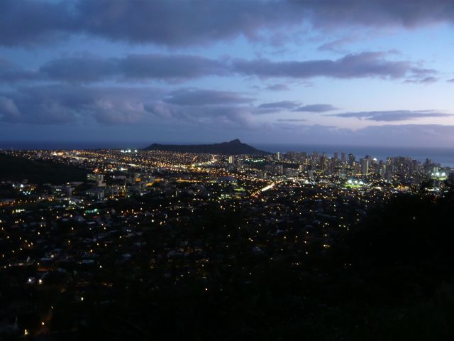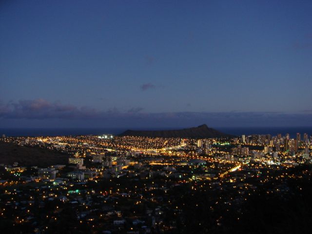 ダイヤモンドヘッドをバックにした住宅街の街灯の明かりが見えるでしょうか?