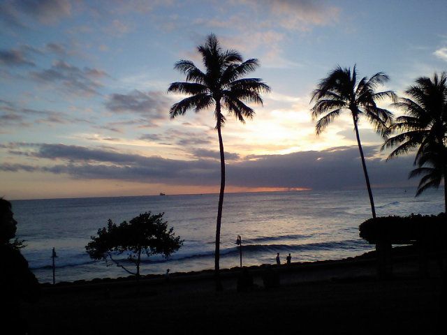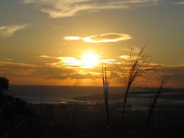 ハワイでは、海岸で見る夕日もすばらしいですが、明かりのついたホノルルの町並みと共に見る夕日もとてもすばらしかったです。また、帰りにできたての暖かい砂糖の付いたお菓子もおいしかったです。