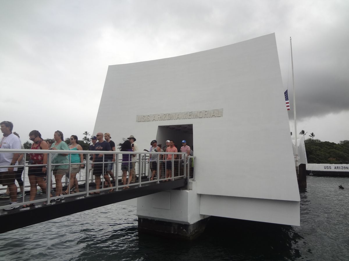 8時ごろ到着。カバン等は基地内には持ち込めず、入口で預けると3ドルぐらいかかるので要注意です。この日は「高波」のため、すぐにミズーリメモリアルには行けませんでした。ガイドさんからもらったチケットには3時間30分後の11時30分の刻印が押されていました。近い時間に取ると、欠航もありうるということこのような取り方になったようです。戦艦アリゾナには車で橋を渡っていきます。艦内ではアリゾナにアタックしてきた大日本海軍の兵士を水葬した話に心が動かされました。下船後は、航空博物館に行きますが、本ツアーでは含まれていません。