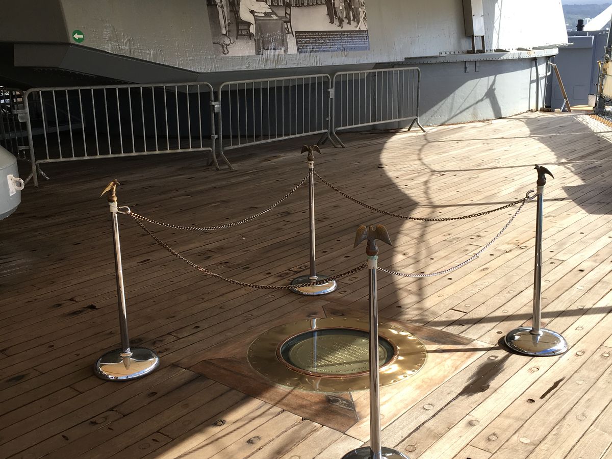 終戦の式をしたデッキやサインをした書類…日本軍カミカゼが傷つけたところや日本軍のためにお葬式をしてくれたなど知らない歴史を知りました。