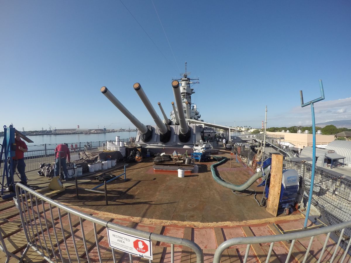 バス集合までの自由時間に2番と3番は小さなラッタルを上がって砲党内が見れますので、ぜひ内見を。また現在は1番から艦首に向けて甲板の張替え作業中だったので、綺麗な写真は撮れないのは残念でした。ただしながら第二次世界大戦中の旧装備、1番砲塔前に左右に設置してあった、40mm4連対空砲の砲座痕が見れるので大チャンスです!木製甲板を取り去った綺麗な赤茶色のモルタル下地が見られます。取り外された対空砲はミズーリの入り口に飾られています。