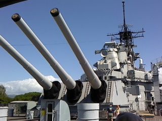 甲板に立ってみると三本の主砲、副砲、機関砲等が並び、映画のワンシーンが脳裏に浮かんできた。ガイドの説明を受けながら甲板を歩いていると、沖縄海域においてゼロ戦特攻機が1機ミズーリに向けて右舷船尾付近に衝突したその傷跡が痛々しかった。人間の意志の強さや使命感、時代背景が走馬灯のように過ぎ去った。