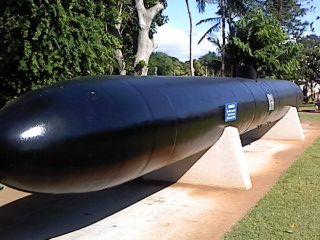 アリゾナ記念館に到着後、10分の記録映像鑑賞・人間魚雷「KAITEN」の見学・潜水艦ボウフィンを外から見学することができました。