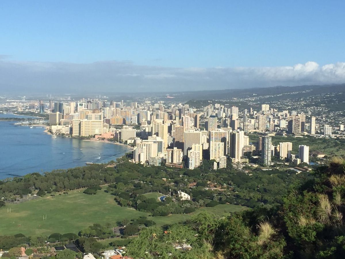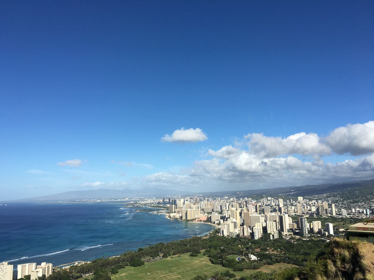 まず目指すのはダイアモンドヘッドの頂上です。朝から日差しが強く、30分ぐらいで頂上に到達!暑いので少し疲れましたが、目の前360°の大パノラマの景色を見て癒されました。頂上から見るワイキキの景色も素晴らしかった。