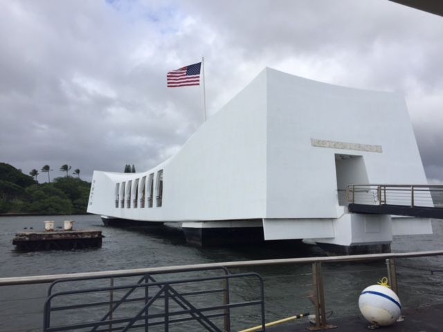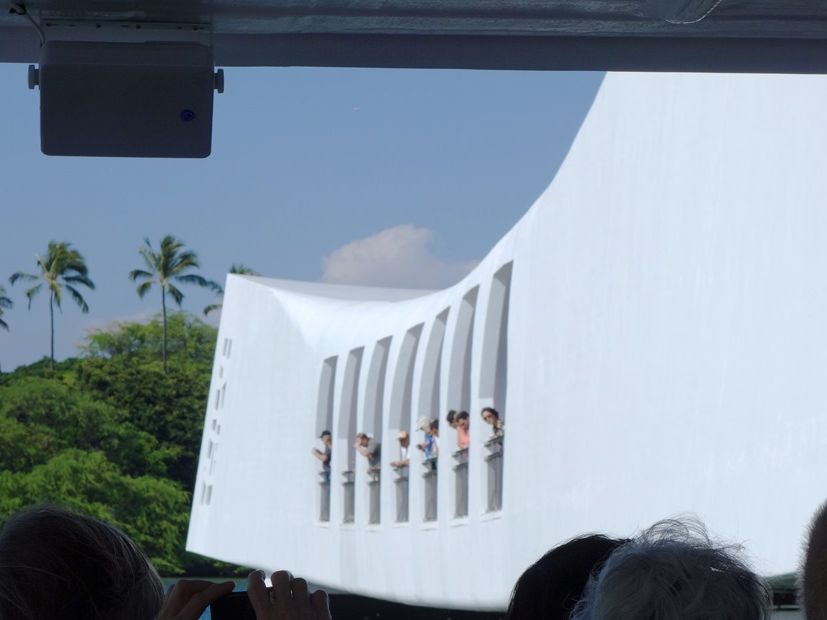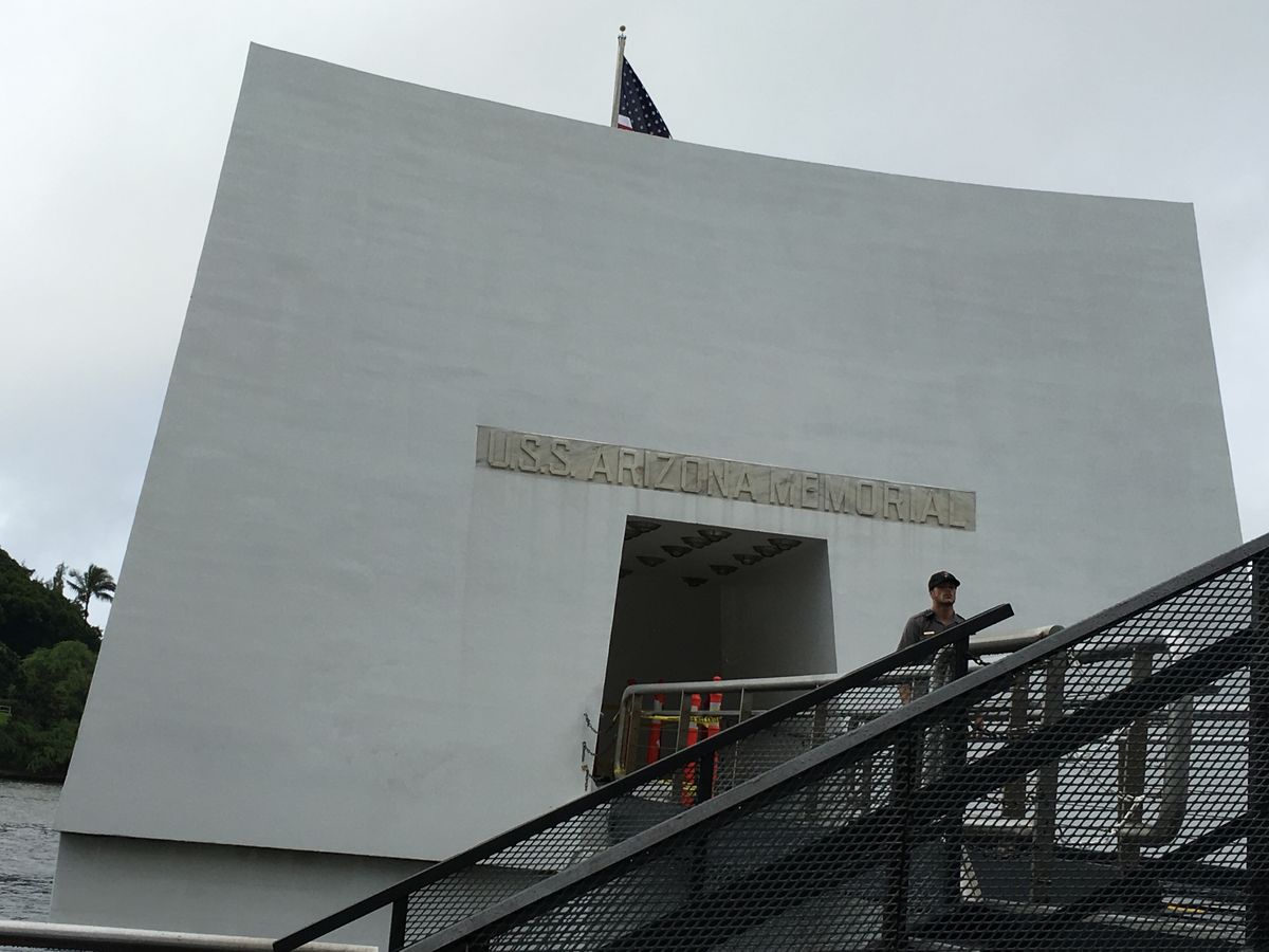 船で行くアリゾナ記念館へは大きなボートで移動して行きますが近づくにつれ白一色の建物に未も引き締まる思いがしました。降り立って下を覗くとあいにくの雨で濁っている中アリゾナ号の姿が見え70年経過した今でも重油が涌出ているのはそこに確かに眠るアリゾナからのメッセージのように思えました。