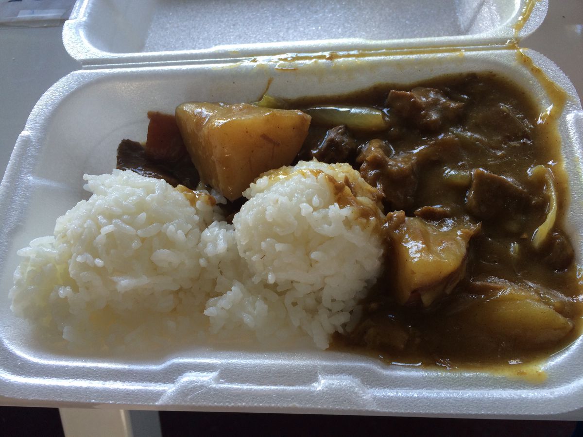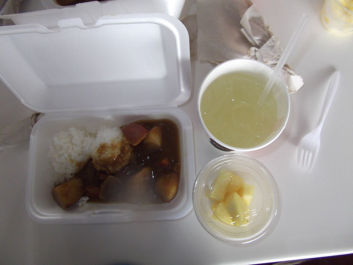 昼食は11:15半頃、カレーとパイナップル、飲み物はコップを渡され自分で選んで入れます。ここで、水をペットボトルに入れることも可能ですが