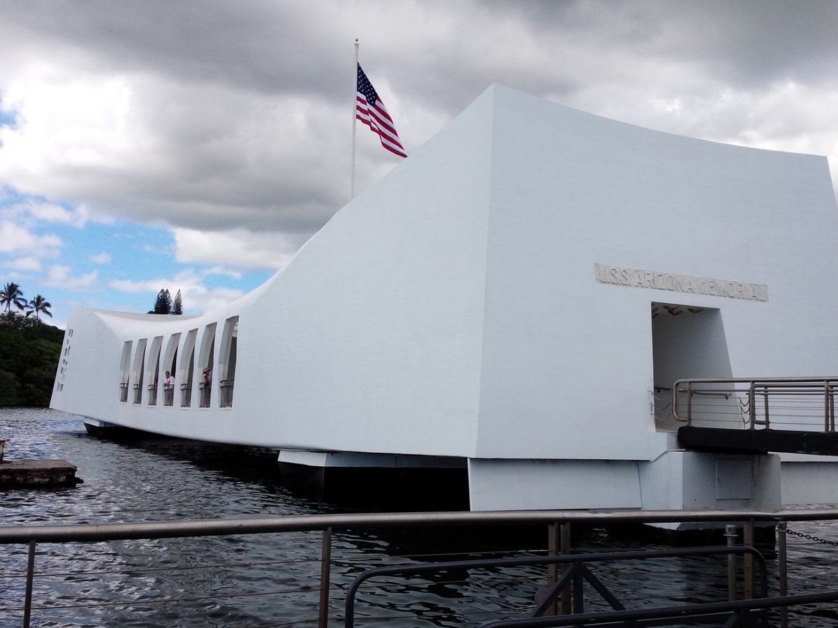 最後にアリゾナ記念館。真珠湾攻撃で沈没した戦艦アリゾナの上に建造された記念館です。海上にある建造物なので、ボートで移動することになります。大変残念でしたが、この日は雷雨によりボートが止まっていて記念館へは渡れず、ビジターセンターのみの見学となりました。沈没から70年以上たった今でも、艦内タンクよりオイルが漏れ出ているという映像を見たことがあったので、直に確かめてみたかったのですが希望かなわず。またいつかチャンスがあれば訪れてみたいと思います。