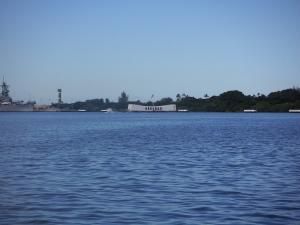 楽しいハワイでそんな惨事があった事を、初めて知り、息子にも、教える事ができ、素敵な家族に、私は片言の単語や英語で、話しかけ快く写真に収める事ができました。写真中央の上の白い建物が海底に沈んでいる船体の上に記念館があります。