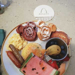 6:55集合のところ50分頃にはきてくださり、アウラニへ着いたのは7:40くらい。余裕を持って8:45に朝食の予約をしていたのですが、ホテル内の散歩を日差しがまだ弱いうちにすることができました。朝食後の時間にキャラクターとのグリーティングをこなすことができ、宿泊せずとも充実した時間を過ごすことができました!