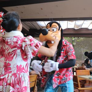 マカヒキでのキャラクターグリーティングの朝食。予約もお願いしたのでスムーズにできました。ミッキー、ミニー、グーフィー、プルートに会え、写真が撮れました。シェフミッキーとは違って、何度も来てくれ、ゆっくり時間がとれゆったりしているのは、アウラニならでは。
