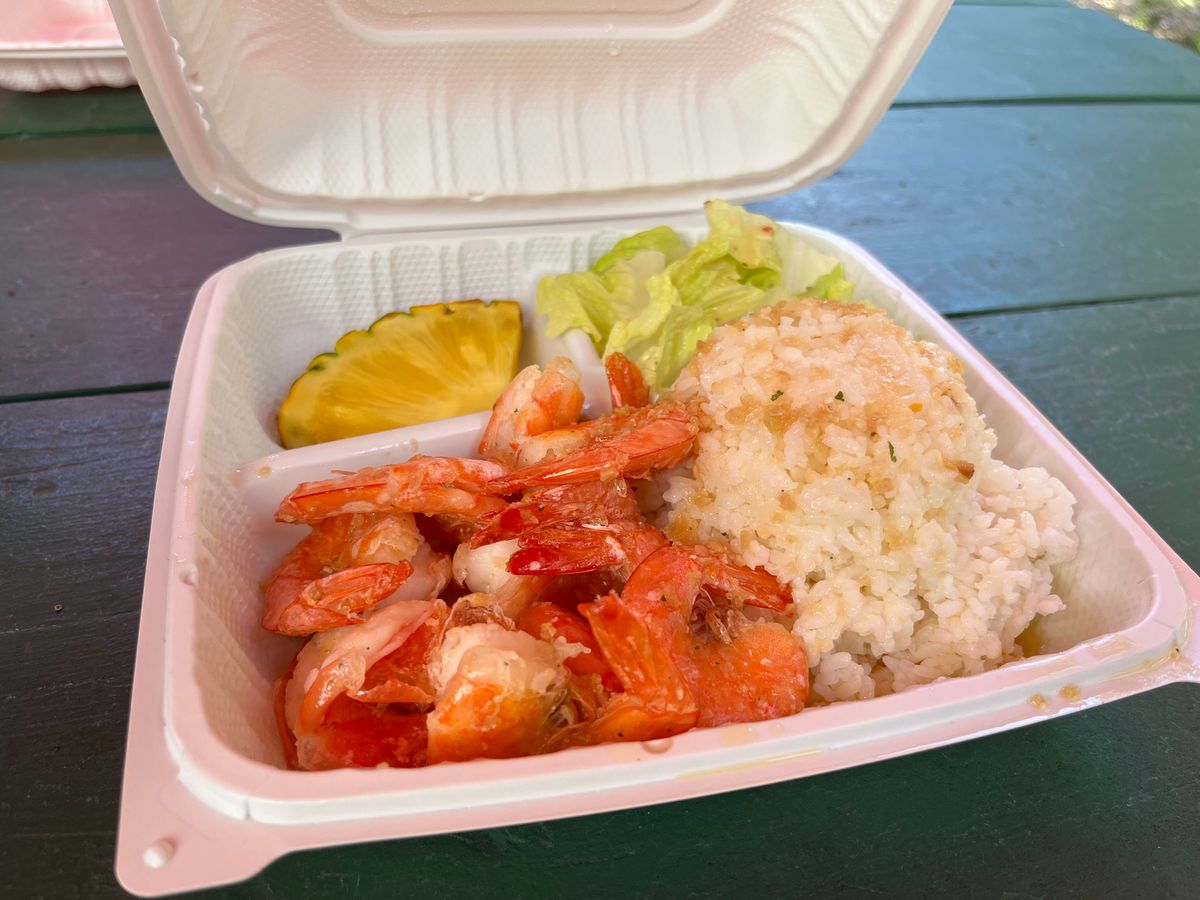 【ランチ】ガーリックシュリンプのエビが10尾以上ご飯に乗っててお腹いっぱいになりました。とてもおいしかったです。移動中に甲殻アレルギーの有無も聞いてくれる配慮もありました。ネットには水1本と記載がありましたが、1箇所目の展望台を出発時に1本とランチで1本、合計2本いただけました。