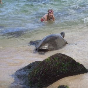ノースショアにレンタカーで行く予定だったのでドライブ以外のアクティビティを探しました。サメにするかウマにするか迷いましたが、可愛い目をしている馬に乗ってみたかったので申し込みました。ジャングルの中を歩くとはどういうものだろうとなかなかイメージできませんでしたが、これは実際に行かないとわかりませんね。ジャングルはぬかるみあり、根っこがぼこぼこでている悪路ありで馬は一生懸命に滑らないように歩いて行きます。景色に見とれていると木にぶつけられたり、途中で草などを食べたり軽く意地悪されます。タイタンという牡馬でしたが、なでたり蹴ったりしながら楽しい一時間でした。途中少し早足になったのですが、それもスリルがあって面白かった。ジャングルのマイナスイオンを浴びてノースショアの絶景を山の上から見る、この体験をした日本人はあまりいないんじゃないでしょうか。牧場の人たちは日本語ベリ少しできます。アサヒ、サッポロ、キリン、ベンジョだそうです。英語わからなくても身振り手振りで確認してくれるので問題ないですね。ナレーションはいらないけれど、ありませんでした。先に仲間が書いていたけど、カメも見れたし、エビもかなりうまかった。