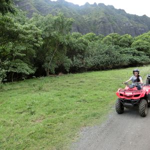 泊まったホテルわWaikikiのど真ん中でしたが、徒歩15分ほど離れたホテルからの出発でした。しかし、寝坊してしまい5〜10分ほど遅れて伺いました。しばらくしても迎え来ないと思い、ホテルのフロントの人にクアロアランチに電話確認してもらい、やはり送迎バスは出発してしまっているとのことで、タクシーで向かいました。クアロアランチまではタクシーで90ドルと痛い出費でしたが、それを思わせないほどアクティビティは楽しかったです^_^9時少し前に到着し、9時15分からのジャングルクルーズになんとか間に合いました!11時から昼休憩でなんちゃって(数種類)ビュッフェを食べました。味は美味しかったです^_^テラスで食べました!そのあと12時から4輪バギーに乗りました!簡単でとても楽しかったです!1時間じゃ足らないし、もっと自由に行動したいと思いました^_^そのあとは、映画ロケ地巡りをしました。たくさんの映画が撮影されてるんだなーって、次映画を見るのが楽しみになりました!帰りは予定のバスで帰りました。帰りは満席でした。人気なのでしょうね。結果、もっとワイキキの中心でピックアップしてもらえると助かると思いました思いました(o_o)しかし、天気もロケーションも最高で、本当に楽しかったです!乗馬も予約すれば良かったなーと後悔( ̄∇ ̄)