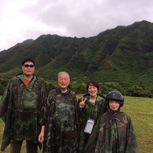私たちが、ハワイポロクラブについてすぐに、大雨に降られしばらく乗馬が始められませんでした、、その後、小雨になり、雨上がりの爽やかな中、快調に乗馬を楽しんでいたら、、娘の乗った馬が濡れた体を乾かそうとしたのか、しゃがみ込んでしまい、びっくりしましたが、ガイドの方が、迅速に対応してくれたのと、娘も、乗馬には慣れていたので怖がることもなく、再びスタートすることが出来ましたが、こう言うことは初めてだったので、びっくりしましたが、改めて、私たちは、機械ではなく、生き物に乗っているんだと実感しました。