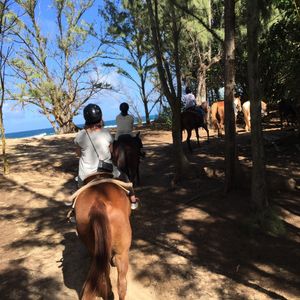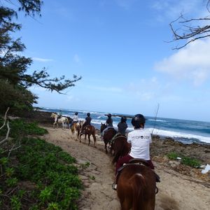 ノースショアの海辺をのんびり乗馬しました。よく訓練された馬達で林の中や海辺の道を ポコポコ。日光浴や釣りをしている人、ノースの波を見ながらの気持ちの良い体験でした。ハレイワの散策ではアボガドバーガーやシェイブアイスも食べて大満足のツアーでした。