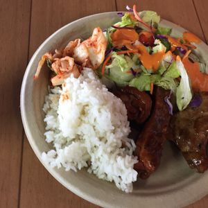 ランチはバイキング形式で、バーベキューっぽいものでした。サラダにお肉(スペアリブとテリヤキチキン)、フルーツにケーキもあり、とても美味しかったです。