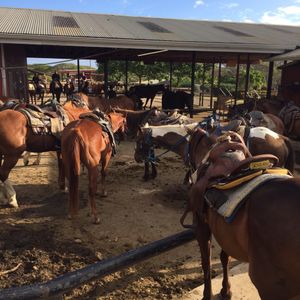 尚、牧場があるLaieは、ワイキキからレンタカーで1時間強かかるノースショアにあり、ポリネシアンカルチャーセンターの少し先。ワイキキの天気とは異なる場合があり、当初私が予約した日は、ワイキキは晴天だったが、現地は雨が降ったり止んだりで、トレイルがぬかるんで馬を走らせるのが危険とのことで直前に中止になり、途中で引き返すハメに遭い、たまたま空いてた翌日に予約し直して参加出来ました。ベルトラも現地催行会社も牧場も、とても親切な対応して頂いたので良かったですが、上級コース参加者はワイキキを出発する前に、牧場に直接電話して現地の天候をチェックし、ツアー催行の確認をお勧めします。初心者向けの歩きだけのコースは、多少の雨でも催行出来るそうです。