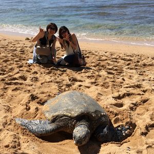 ウミガメをビーチで見る事もできました、プロサーファーの大会が実施される大きな波が来るビーチにも途中立ち寄りして頂き、大波のパイプラインを生で初めて見ました。