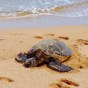 砂浜に、岩のような甲羅を背負った海ガメが日向ぼっこしてました♪