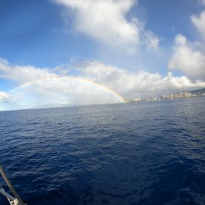 この日はよくウミガメを見ましたが、一度に最大7匹のウミガメがいるのを見たのは初めてで、しかも距離が近く大変興奮しました!ガイドのマットさんがゴープロで撮影をしてくれて、後ほどメールで送ってくれるのですが、すぐ見たいと思いiPhoneのメールアドレスを教えたのですが、エラーが発生して送られてきたのはわかったのですが、見ることができませんでした。パソコンのアドレスを教えれば良かったです。大きな虹が出たのと、イルカの群れが現れたのは素晴らしいサプライズでした。