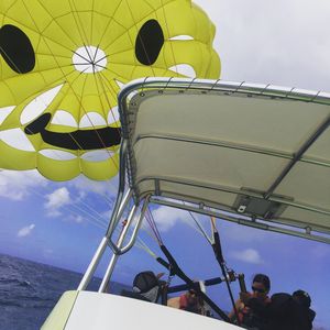 移送ボートから沖へ行き、海上で専用設備のある船に海移らなければならないです。波のうねりが強く、皆海水でびしょ濡れだったので、足場が揺れ滑って落ちないか少し怖かったです。また酔いやすい方は事前に酔い止めをおすすめします。パラセイリング自体はスリルがありとても楽しかったです。最高の思い出になりました。やってよかったです。