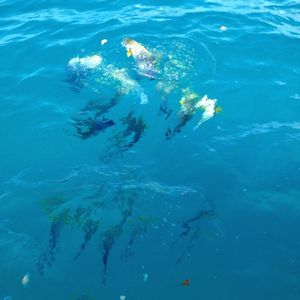 ジジババ、パパママ、子供2人の6人でハワイへ、私は初めてのハワイ旅行でした。寝ている子供たちをジジババに任せて2人で海遊びへ。昨日通った東海岸の道をハーバーまで行き、そこから船で沖合へ。酔いやすい私は、そのちょっとの間の船でも気分が悪くなりそうでした。sea bob楽しかったです。ど近眼の私はシュノーケルや海遊びでよく見えないのが悩み。なのにコンタクトつけたままで大丈夫だし、気分最高。でも思ったよりお魚が大きくてびっくり。イメージではエンゼルフィッシュみたいな熱帯魚が寄ってくるのだったけと、来たのは20センチ以上ある黒っぽいお魚たち。餌を持っている手をかじられそうになりちょっと怖かった。でもきれいな海の中を十分楽しめました。最高でした。
