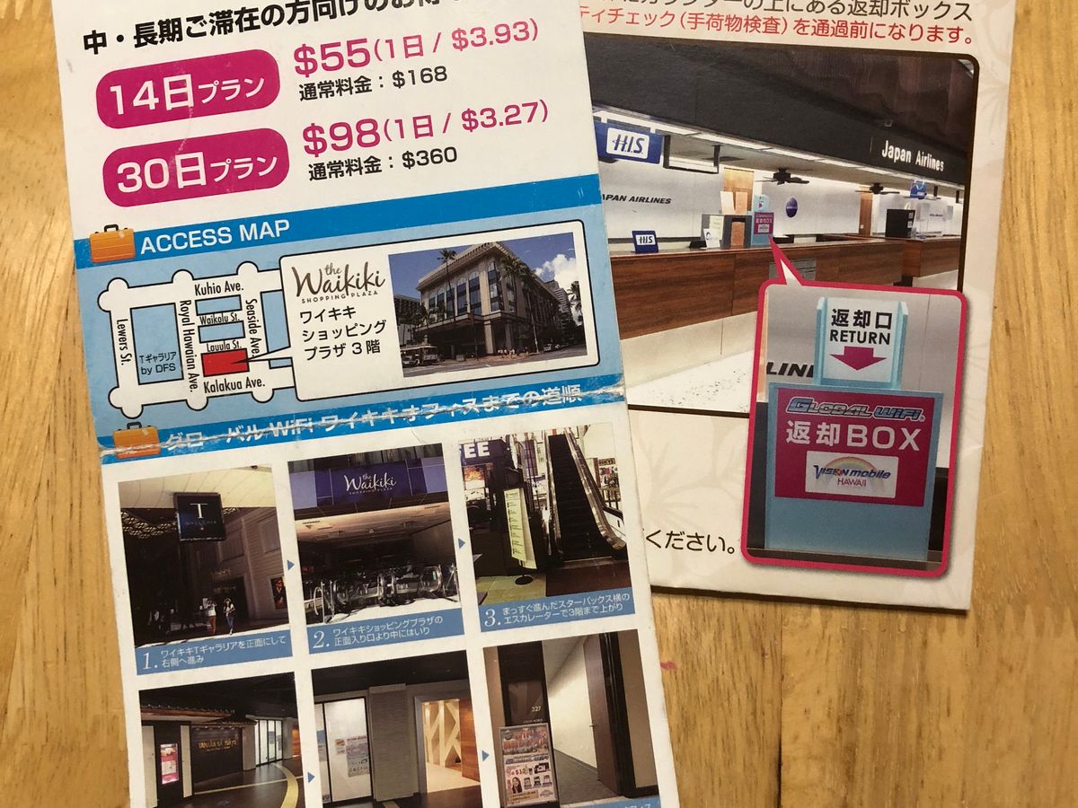 レンタル場所はワイキキ中心部でわかりやすく、スピードもホテルの無料WiFiより早く便利でした。