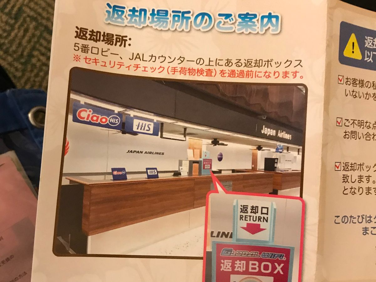 返却は空港の専用BOXに返しました。見つけられなかったらどうしようと少し不安でしたが、JALのチェックインカウンターの目立つところにあり、すぐにわかりました。