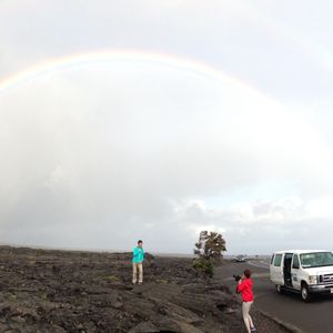 溶岩チューブに着くころから雨が降り出し、アンディさんが皆に傘を貸してくれました。(2人一つですが大きな傘です。)にっこり顔のクモに会えずに残念ですが絶滅してしまった鳥や今保護している鳥の話を聞きました。途中途中溶岩の変化なども本当に細かく説明下さいました。溶岩ウォークでは雨もちょうど上がっていて虹も何度か見れて、みんなテンションがあがったきたのかジャンプ写真が流行り、なんだがみんなで和気あいあいとして楽しかったです。ツアー参加されている人もいい人が多くてよかったです。(ずっと離れて座っているご夫婦がいて席のことなど少し気を使ったのでここがもう少しどうにか皆がローテーション出来たらいいのになと思いました。)夕飯を溶岩に座って頂いたのですがスパムむすびの入ったお弁当はおかずも和食でほっこりしました。雨が降ったりやんだりでしたが、一番歩きたいときにはやんでいてペレに感謝です。