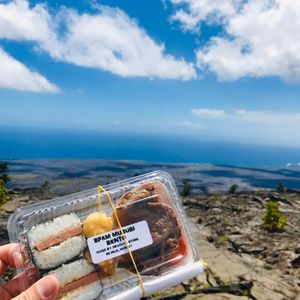 溶岩の上で食べるランチは絶景でサイコーでした!!スパムおむすび弁当美味しかったです。