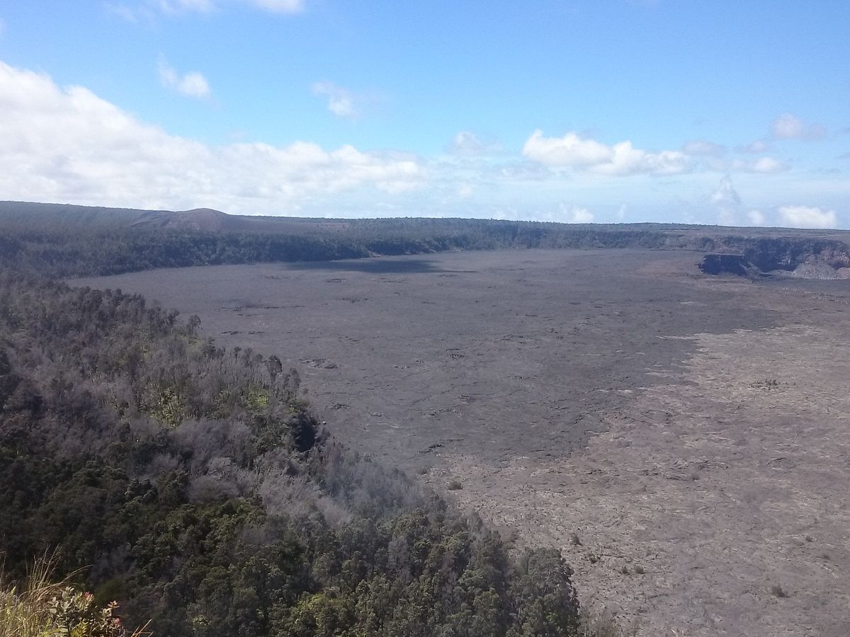 キラウエア火山は赤い溶岩は見れません。広大な土地と地面から湧き上がるガスを見る事ができました。火山口も真っ黒で、全てが黒い岩石でした。