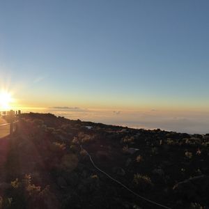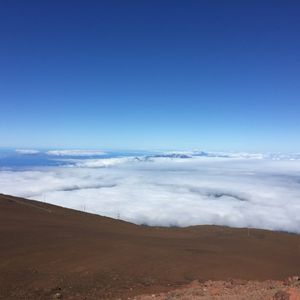 朝4時半にホテルピックアップでホノルル空港へ向かい、そこで1時間半~2時間待ちます。そのあと30分程度のフライトでマウイ島のカフルイ空港に着きます。そこからはまたバスに乗ってハレアカラ山頂(3000m)まで移動します。山頂にはトイレがないので、途中、ふもとの売店でトイレ休憩があります。そこからは一気に山頂まで向かいますが、だんだん雲が自分たちの目下にいくことに感動します。山頂についたときには晴れていたのですが風が強かったので、もし参加される方は、なにか羽織るものを持っていくことをおすすめします。わたしたちはウルトラダウンを持っていったので大丈夫でしたが、Tシャツで参加されていた中年ぐらいのご夫婦は山頂の売店でパーカーを買っていました。
