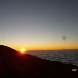 いよいよ陽が沈み水平線より下に下がっているのにもかかわらず、山頂はまだ明るくびっくり、そして自分の背後を観ると地球の影が空にせり上がってくるのがわかりました。このときの光景はカメラで再現できないほどの神秘的なものでした。
