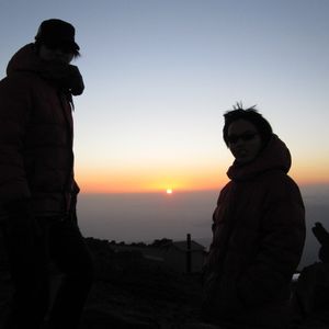 マイクロバスに乗り、頂上まで行きます。寒いと聞いていたので、私はトレーナー、ダウン、マフラー、手袋を持っていきました。ダウンはバスにも積んであり、借してくれますが、寒いので各自でもいろいろ準備していくことをお勧めします。