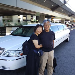 ホテルのロビーで待っていると、名前を呼ばれて荷物を持って運転手の方について行くと、ホテルの前にリムジンが停まっていました。観光地でリムジンが走っているのは見かけましたが、乗るのは初めてでした。ホテルからの乗車は、6人でした。途中追加乗車無しで空港まで送って貰いました。航空会社のチェックロビー毎に降ろしてくれて、私達二人が最後でした。リムジンから降りて、荷物を降ろしてくれている間に車の写真を撮っていると、運転手の方が車をバックに写真を撮ってくれました。ハワイ旅行の最後にとても良い記念になりました。