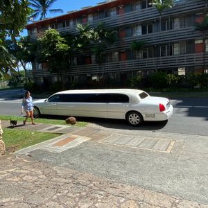 コートヤードのロビーでピックアップ時間の15分前に寛いでいると10分前に運転手が到着。ロイヤルハワイアンホテルで2組ピックアップして20分程で空港到着。リムジンに6人で快適でした。