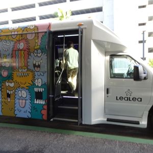 ハワイに着いたら、定番のHISシャトルバスでホテルへ向かうのは当たり前になってます。何にも迷わず、余計な事を考えずに案内してくれるので安心です。今回はカカアコ地区で有名なウォールアートデザインの「モンスター」がシャトルバスになり、迎えに来てくれました。可愛くて良いですね!