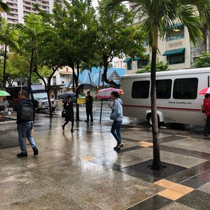 しかし、当日の帰国日にカラカウア通りでのパレードのため交通規制となり、ホテルまでのシャトルバスが乗り入れできない、とのことでシェラトンからギャラリア沿いまで徒歩の移動となりました。天気も悪くまとまった雨空でした。パレードの実施は最初から分かっている事だと思うので、予め知らせていただきかったですね。あの天気ではタクシー空港まで行きたかったです。