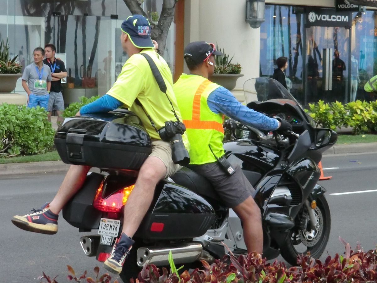 H.I.S.のシャトルは、チケットの色と番号で呼んでもらえます。シャトルを待つ間も、いろんな人が行き交っています。圧倒的に日本人が多いのは、ホノルルマラソンのためでしょう。日本から一万人以上の人が一気にホノルルに乗り込むのですから、当然です。