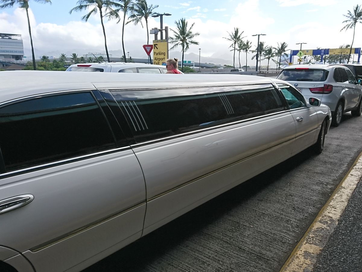 ホテルで空港行のお迎えバスを待っていると、リムジンがロビー前に到着しました。「あんな車に乗る人もいるんだな。」と家内と話していると、リムジンから降りてきた運転手が自分たちの名前を呼ぶではありませんか!「え?これに乗っていいの?」と聞いたら、「Yes」との返事、思わず運転手にリムジンを背景に写真撮影をお願いしてしましました。ただ、当たり前ですが、自分たち二人だけで乗れるはずもなく(最初は、そうかな?とも期待しましたが・・・)、その後二組が乗車され、結局運転手を除く7名の乗客で空港に向かいました。でも、他のお二組もリムジン乗車にはかなり喜んでおられました。ハワイ旅行の最後に思いがけない思い出の追加ができました。