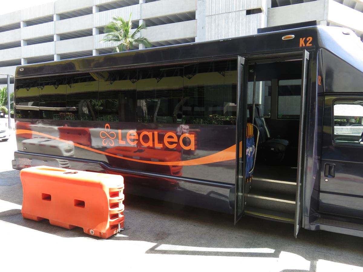 空港からの公共交通機関が見つけられなかったので、この送迎をお願いしました。受付で貝のレイを首に掛けていただき、ハワイ気分は盛り上がりましたが、出発時間の待ち時間が結構長かったのが残念でした。