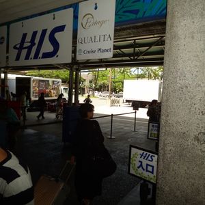 空港の団体出口を出たところにHISのデスクがあるので、そこでチェックインします。貝などで作ったレイをプレゼントされたので少しうれしかったです。受付番号をもらったら二階のバス乗り場に行ってLeaLeaのバス乗り場で受付して待機。ここで意外と待たされますし、混載なので色んなホテルを回って乗客を降ろしていくので、時間に余裕がない人は他の手段の方がよいかもしれません。