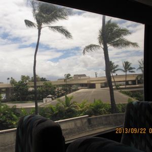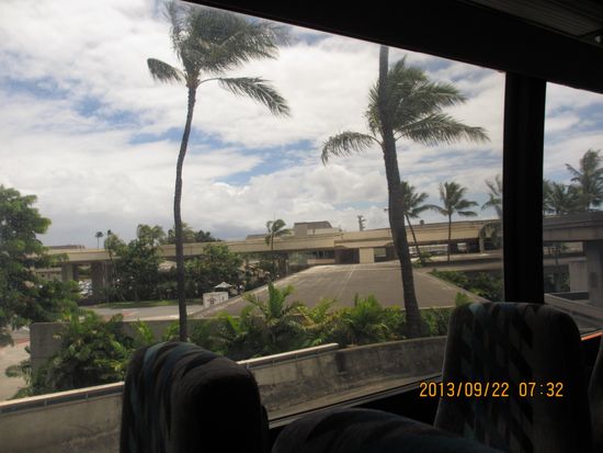 シェルのレイをかけてもらえて、一気にハワイ気分になりました。バスもきれいで、運転手さんがハワイ語を教えてくれました。