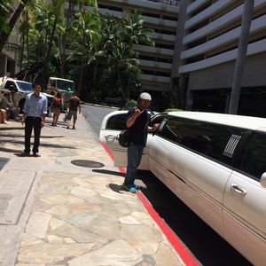 楽しかったハワイ滞在の最終日、もう日本に戻り日常生活かとチョット淋しいきもちでロイヤルハワイアンセンター横でバスを待っていると到着したのがビックリのリムジンでした。思わず通りすがりの観光客の方に頼み写真を取っていただきました。その後もう1箇所ホテルにピックアップにより、2人増え総勢5人、すし詰め少し手前で気持ち良く空港まで送ってもらえました。