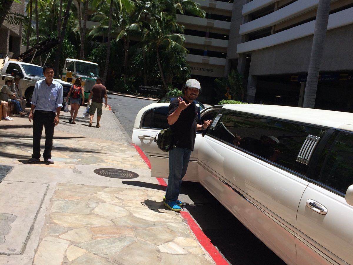 楽しかったハワイ滞在の最終日、もう日本に戻り日常生活かとチョット淋しいきもちでロイヤルハワイアンセンター横でバスを待っていると到着したのがビックリのリムジンでした。思わず通りすがりの観光客の方に頼み写真を取っていただきました。その後もう1箇所ホテルにピックアップにより、2人増え総勢5人、すし詰め少し手前で気持ち良く空港まで送ってもらえました。