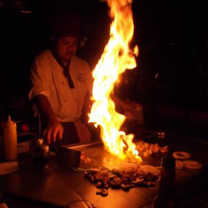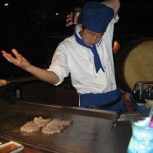 ハワイに来るたびに広告で良くみかけるのでぜひ行ってみたいと思っていたので今度は前もって予約して行きました。予約は必要ないだろうと思っていたのですが、仲間がいるので当日ばたばたするのがいやなので予約しました。結果は、大正解。遅めの午後8:30に予約したにも関わらず入り口人が並んでましたし、中はパーティ会場のように座席がいっぱいでした。あちこちのテーブルで歓声があがり、なんとなく気分が高まってきました。料金はステーキコースで$20~30でリーズナブルだと思いました。フィリピン人のシェフが包丁・炎のパフォーマンスとジョークでなかなか楽しく食事を開始することができました。言葉の関係でしょうか、日本人のテーブルとアメリカ人のテーブルに分かれているようでした。まあ、味は少々大味ですが、気分もいいのでパクパクと食べてしまいました。あとから考えればハワイではかなり美味い部類かもしれません。もちろん、残ったものは、覚えたての「ボックス、プリーズ!」と言ってテークアウトしてホテルで夜食にしました。東京でもこの店があればいいなと思ったのですが、紅花はかなり高価ですからね。残念です。ハワイに来たらまた行きたいと思いました。