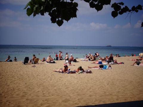 朝起きて ワイキキをビ一チ沿いにのんびり散歩 ホテルが離れていたので30分くらいブラブラ歩きました 着いたときは もうお腹ペコペコ とっても美味しかったです 海外デビューの友達も美味しい 景色も最高と大喜び やったー ただ早くに予約したのに席が 真ん中だったのが・・・・