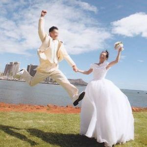 すばらしいコストパフォーマンスです。一生の思い出ができました。私は、二度目の結婚だったので結婚式を挙げずに入籍だけしていました。でも、子どもが産まれた時に、写真を見せてあげたいなという思いと、一つのくぎりとしてやっぱり式を挙げておきたかったので、色々探していました。他の方の口コミを読んでこちらにお願いしましたが、大正解。本当によかったです。もし、迷われている方がいたら、こちらに決めてください。他にも高いのが載っていたと思いますが、こちらで十分だと思います。当日、車でピックアップされて行きます。着いたら、ドレスやタキシードを選びます。たくさんあるのですが、自分の一目惚れでパパッと決まりました。追加料金が200ドルかかるものでしたが、もともとお支払いしている金額が安いので、必要経費だと思いました。彼のタキシードも黒がもともとのプランですが、白が絶対いいと決めていたのでこちらも追加で150ドル払いました。一番うれしかったのが、ヘアメイクです。メイクしかしてもらえないんだとなぜか思いこんでいたので日本でパーマをわざわざかけていったのですが、必要なかったみたいです。髪もメイクも日本人の美容師さんが本当に丁寧にしてくださいます。髪は、まいてくれてメイクも見違えるようにきれいにしてもらえました。お姫様気分でしたよ。すごくうれしかった~。準備ができたら二階のチャペルで式を挙げます。簡単なリハーサルもしました。牧師さんが、雰囲気のよい方で、すごく和やかに式を挙げられました。日本で挙げるような式です。きちんとしていて、「式」という感じが十分にしました。感動して泣きそうになりました。二人だけの式で、寂しい感じがするんじゃないのかなと思っていたけど、全然そんなことはなく、牧師さん・カメラマンさん・衣装を一緒に選んでくれた人・オルガン奏者の4名の方が、心からお祝いしてくださいます。その後は、ビーチに移動して写真撮影です。カメラマンさんが女性の柔らかな雰囲気の方で、リラックスして撮影ができました。普段は、写真嫌いの彼なので、ここぞとばかりにたくさん撮ってもらいました。カメラマンさんの方から「向かい合ってください。」とか、「ブーケをこちらに少し向けて」など、色々言ってくださります。こちらからも、こんな写真が撮りたいということを伝えると、気持ちよく撮ってくださいました。ROMを数日後いただいて、で