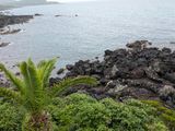 梅雨時で朝から曇り空ではありましたが、幸い鬼岳の展望台からは海や周囲の山々を一望でき、360度の景色を堪能することができました。火口跡を目指してさらに登り始めたあたりで雨がサーッと降ってきて、風も強かったので引き返すことになりましたが、さっき遠くに見えた黒い雲があっという間にこちらに来たな~と実感することが出来て、それはそれで楽しめました。遠くから眺めるだけでも緑が綺麗な鬼岳ですが、くみさんのガイドを聞きつつ実際に歩いてみると、その後に見る溶岩海岸や町なかの古い石垣の見え方も違ってきます。